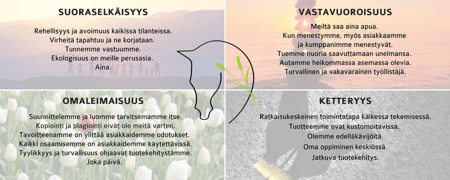 Kannatamme läpinäkyvyyttä ja siksi halusimme avata asiakkaillemme toimintamme ja tuotteidemme arvopohjan. Alla esitetyt arvot toimivat tien viittoina kaikessa toiminnassamme.